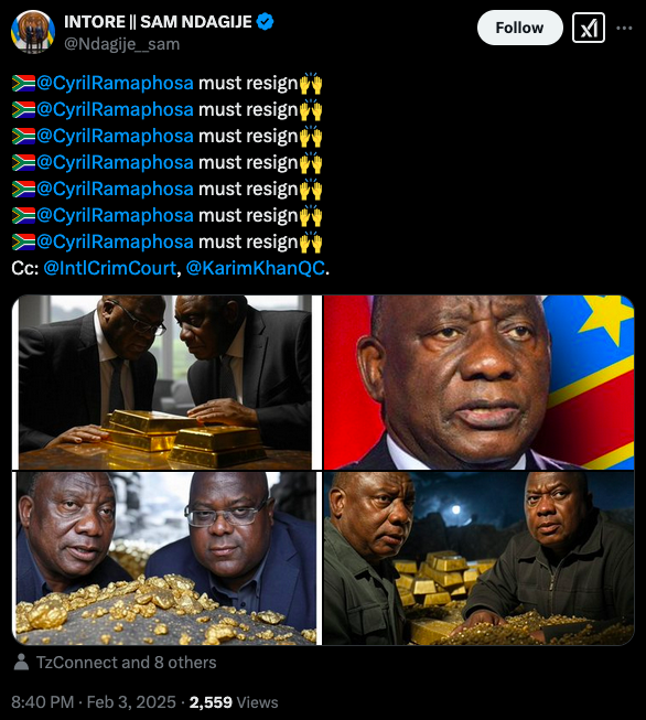 Screenshots of @Ndagjie_sam’s post on X.com calling for Cyril Ramaphosa’s resignation.