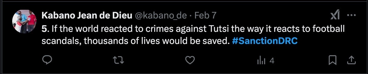 “Corruption, illegal mining, and the trafficking of drugs and resources continue to fund violence and instability in the DRC. The world must hold the DRC accountable by imposing sanctions to stop this exploitation! #SanctionDRC,” read one of its 40 tweets on the topic posted in just 11 minutes on February 5th.