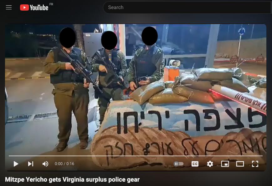 يُظهر فيديو آخر المستوطنين يحتفلون بمعدّات الشرطة التي حصلوا عليها من ولاية فيرجينيا الأمريكية. كان المدعي العام لفيرجينيا جيسون ميارس قد طلب سابقاً من مكاتب عمدة المقاطعة، إرسال معدات لإسرائيل عام 2023. ذهبت المعدات إلى المستجيبين المدنيين الأوائل (على سبيل المثال، المسعفين المدنيين) ولم تتضمن أسلحة أو مدفعية. تشمل أمثلة المعدات المتبرع بها اللوازم الواقية مثل السترات الواقية من الرصاص، والخوذات، والسترات الواقية للكلاب، وحمايات الكوع/الركبة.
