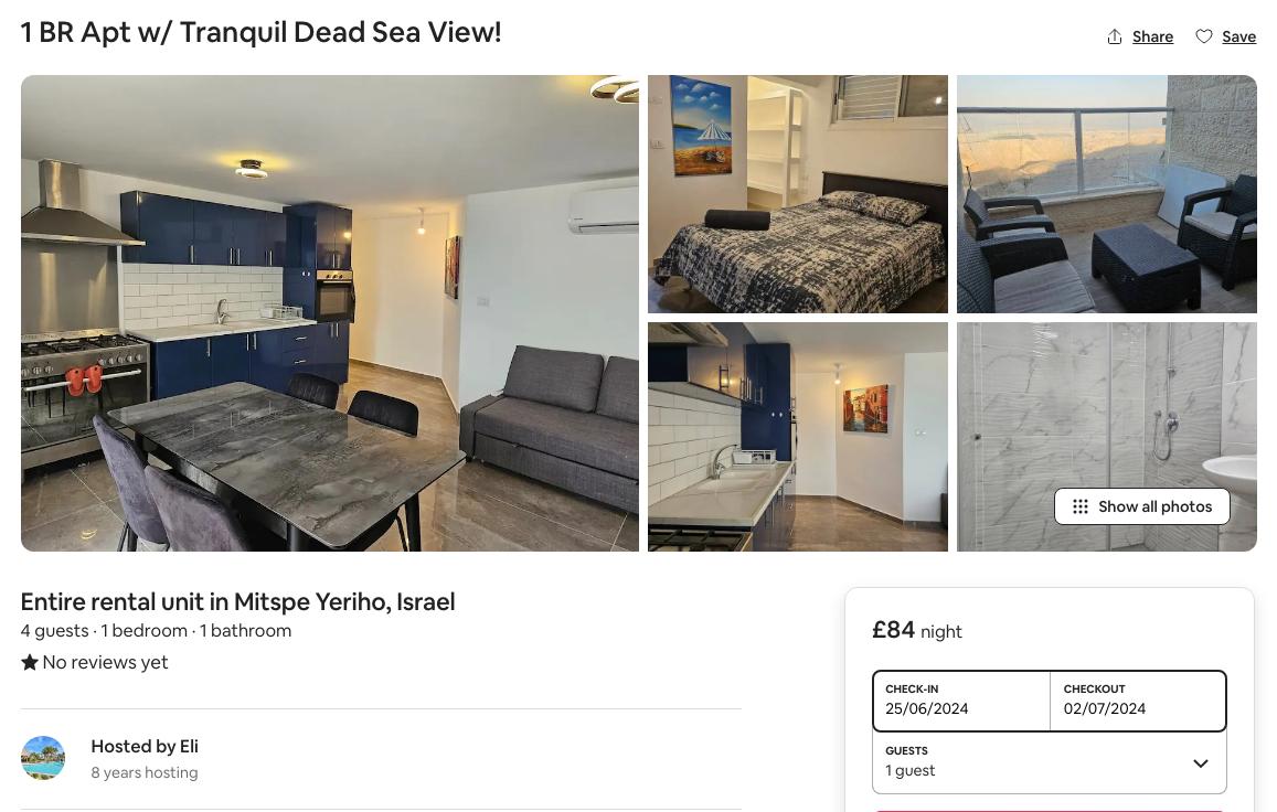 أما بالنسبة للمستوطنين فإن الأعمال مستمرة كعادتها، إذ عثرت “فوربدن ستوريز” على أربع عقارات على الأقل مدرجة حاليا على موقع Airbnb تحت ما يبدو وكأنه قسم فرعيّ قد بُني حديثاً في متسبيه يريحو، إحدى تلك الأماكن يديرها مستوطن يدّعي أنه يقدّم لضيوفه “ملاذاً هادئاً”، وقد علّق أحد ضيوفه السابقين بعد السابع من تشرين الأول/أكتوبر قائلا: “أوصي بشدة كل من يبحث عن تجربة رائعة ومضيف استثنائي بزيارة هذا المكان الجميل، المتمتع بإطلالات خلّابة على الجبال والبحر الأحمر”. (لم يعلق Airbnb أو Ero Rentals)