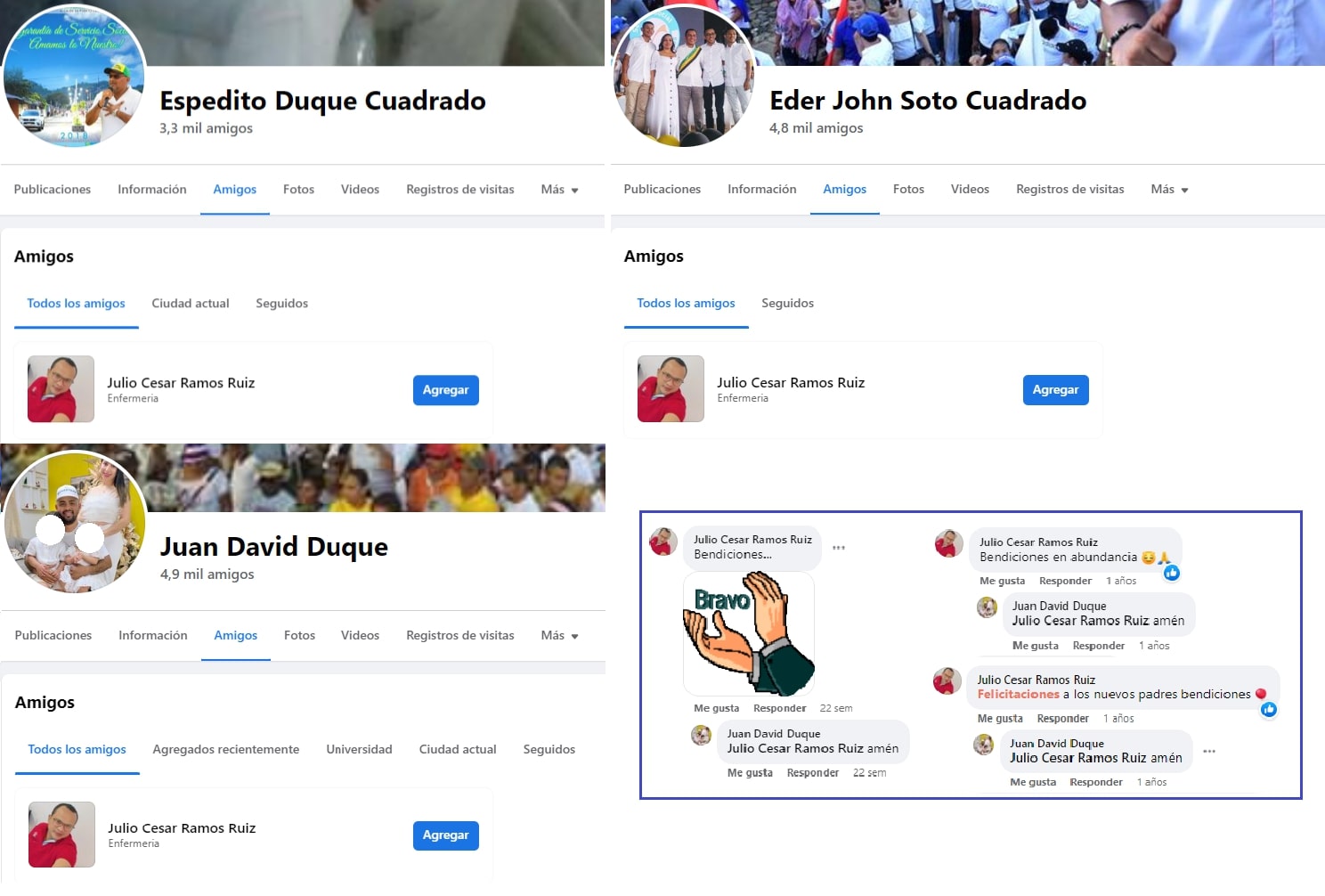 À l’époque où Ramos exerce à l’hôpital de Puerto Libertador, le gérant de l’établissement de santé n’est autre qu’Eder John Soto, le successeur d’Espedito Duque à la mairie de Puerto Libertador. Des photos prises entre 2016 et 2018 montrent que les deux hommes se connaissent et se voient régulièrement. Ramos, Duque et Soto sont amis sur Facebook. L’infirmier y interagit aussi avec Juan David Duque, le fils d’Espedito Duque et ce, après son arrestation. Un document obtenu par Forbidden Stories révèle qu’Eder John Soto a témoigné en faveur de Ramos, son ancien employé et ami d’après l’avocat de Ramos, dans l’optique de son procès.