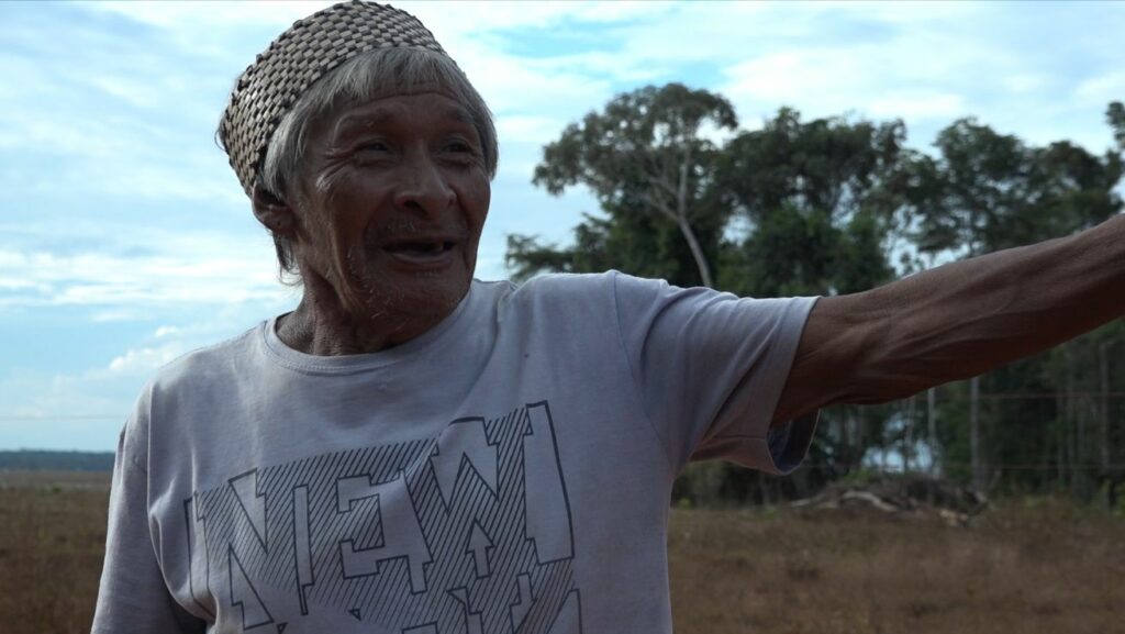 « Ce pâturage, où vivent les Blancs, était notre village », s’exprimait auprès de TBIJ Xinuxi Mỹky, leader de la communauté indigène dont le territoire a été envahi par des éleveurs. Leur ferme livrait ses bœufs à l’abattoir Marfrig de Tangará da Serra. – © Typju Mỹky, Coletivo Ijã Mytyli de Cinema Manoki e Mỹky