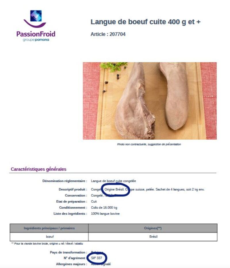 D’autres fournisseurs de restaurants collectifs, comme Sysco et Espri Restauration, qui proposent dans leur catalogue des langues de boeuf d’Amérique Latine, n’ont pas donné suite à nos demandes. Certains ont opposé « des raisons de confidentialité et de concurrence ». Nous nous sommes également adressés à la marque Maison Larzul et au groupe Jean-Hénaff, dont les langues de boeuf, malgré leur origine non-européenne, sont présentées comme des « produits régionaux » sur le site de Carrefour. Le groupe Jean-Hénaff nous a confirmé importer de la langue de bœuf du Brésil, mais aucune des deux marques n’a communiqué son numéro SIF.