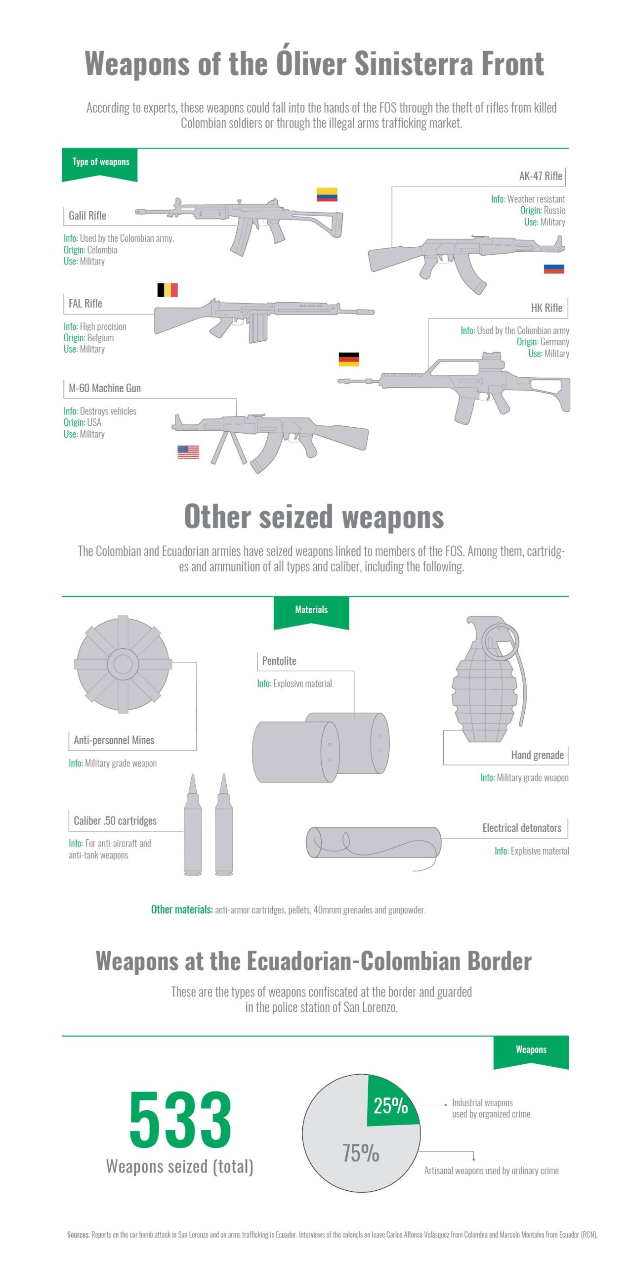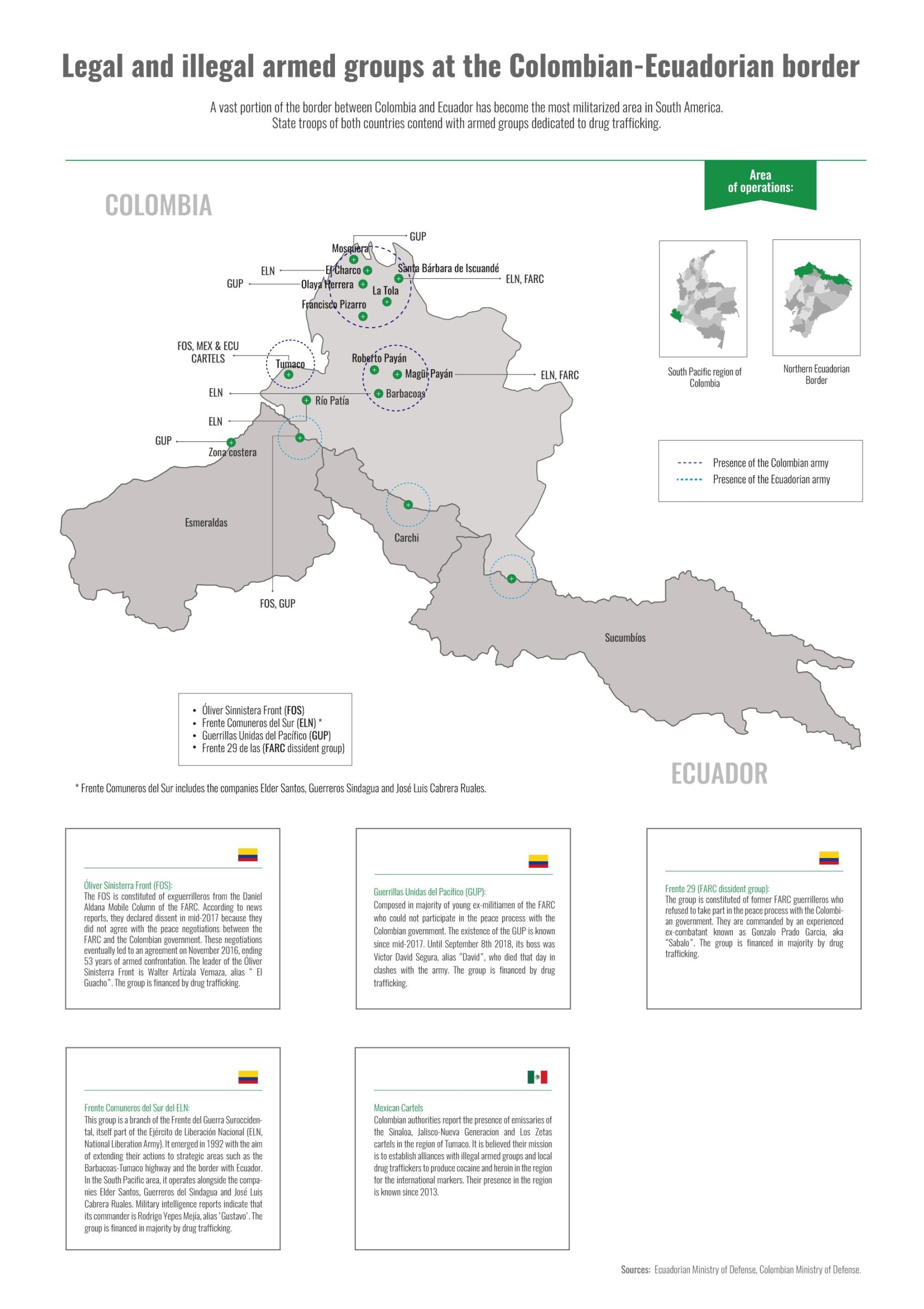 Ces mesures exceptionnelles, combinées à un important renforcement du dispositif sécuritaire, n’ont cependant pas mis fin aux actions du FOS, dirigé par l’ancien guérillero des Forces Armées Révolutionnaires de Colombie (FARC) Walther Arizala, alias « El Guacho ». Entre le 17 février et le 4 avril 2018, il a été tenu responsable d’attaques contre des forces militaires et d’actes terroristes contre des infrastructures électriques en Équateur. Selon les autorités équatoriennes, les offensives d’El Guacho sont la réponse à la multiplication des opérations antidrogues dans la région, mises en œuvre à partir d’octobre 2017.