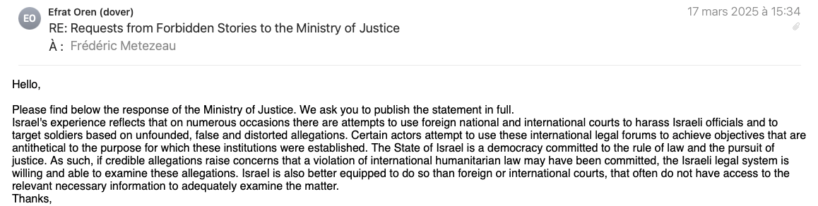 An internal memo from the Israeli State Attorney’s Office, which Forbidden Stories was able to review, acknowledges that while investigation mechanisms are vital for the rule of law, they also serve as a “protective layer for the state and those who act on its behalf against the exercise of authority by international tribunals and foreign courts.” In other words, in the view of the Israeli government, its justice system insulates the army from global instruments of accountability.